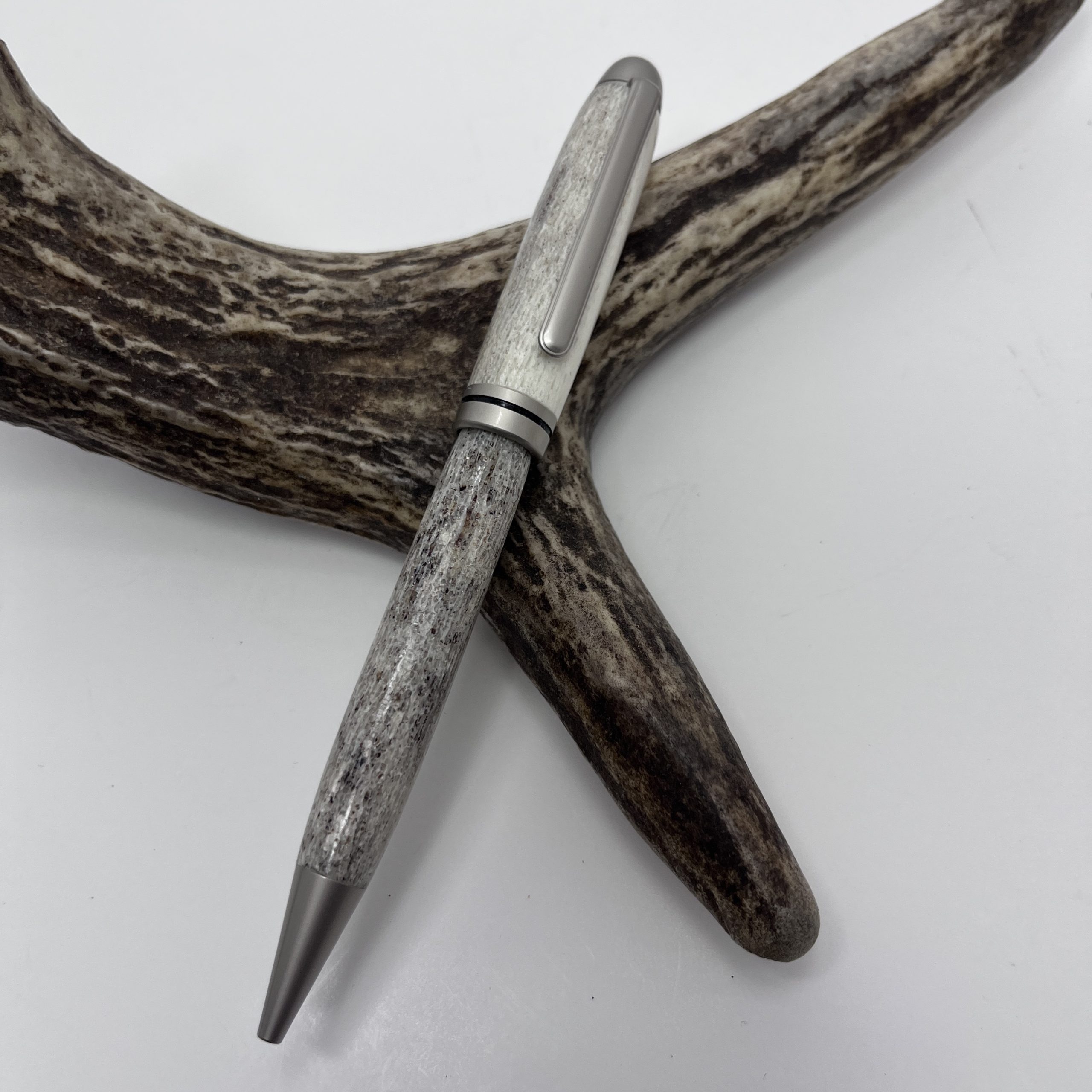 This pen is made from Elk Antler in Mont Blanc Style. It is an elegant larger ball-point pen that makes a powerful statement.